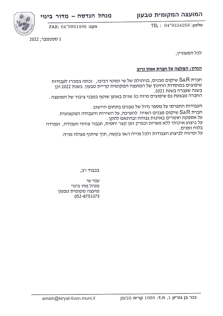 ממליצים עלינו ממליצים עלינו המלצות חברה קובץ מעודכן-05 המלצות חברה קובץ מעודכן-03 המלצות חברה קובץ מעודכן-01 המלצות חברה מוטי רביבו המלצות חברה בלאל כיואן המלצות אס אנד אר-2 תעודת התאחדות 2023 המלצה קבוצת רשף המלצה על חברת אס אנד אר מועצה מקומיתטבעון המלצה מועצה מקומית טבעון המלצה גי אס « ‹ of 4 › »